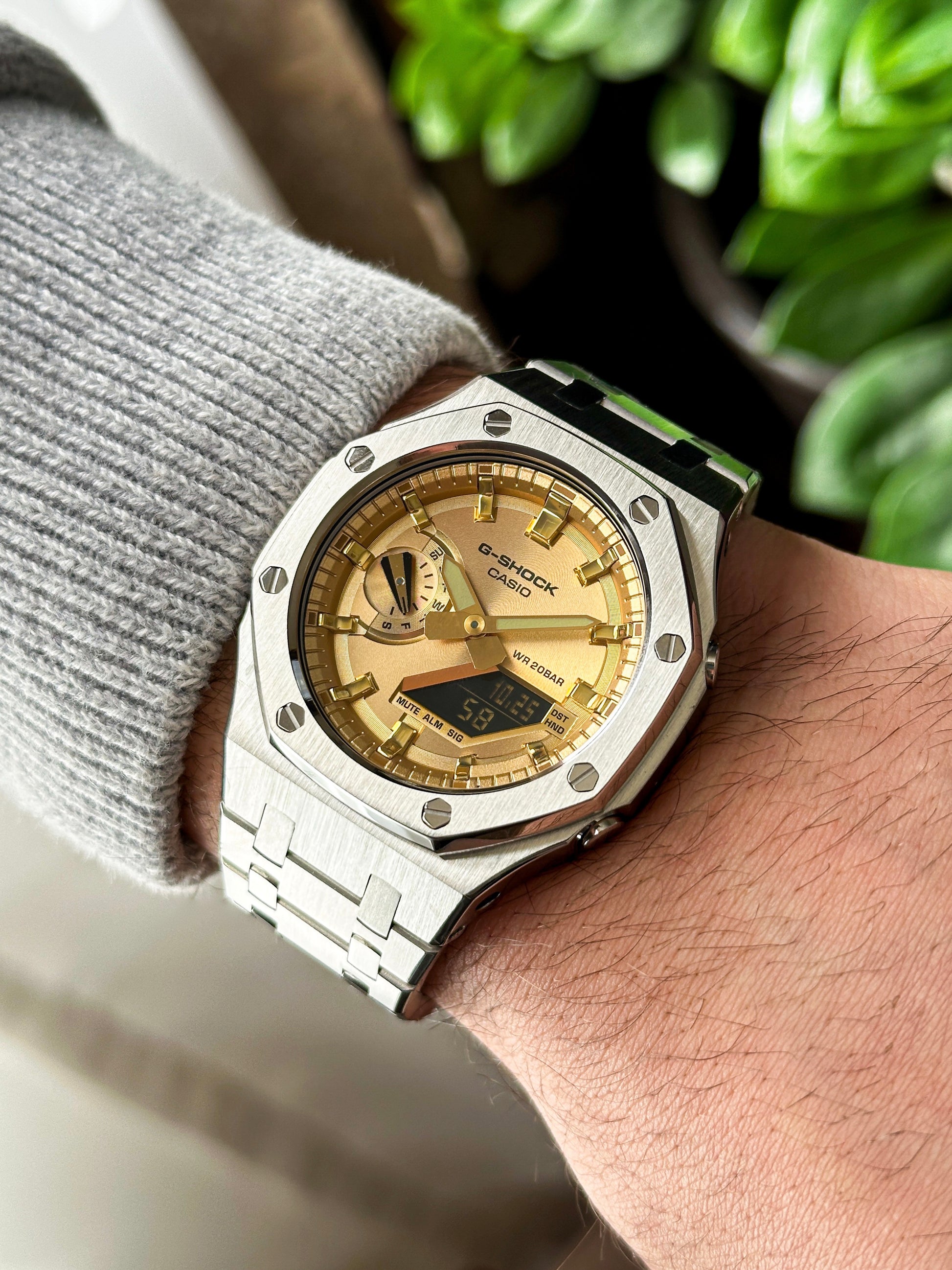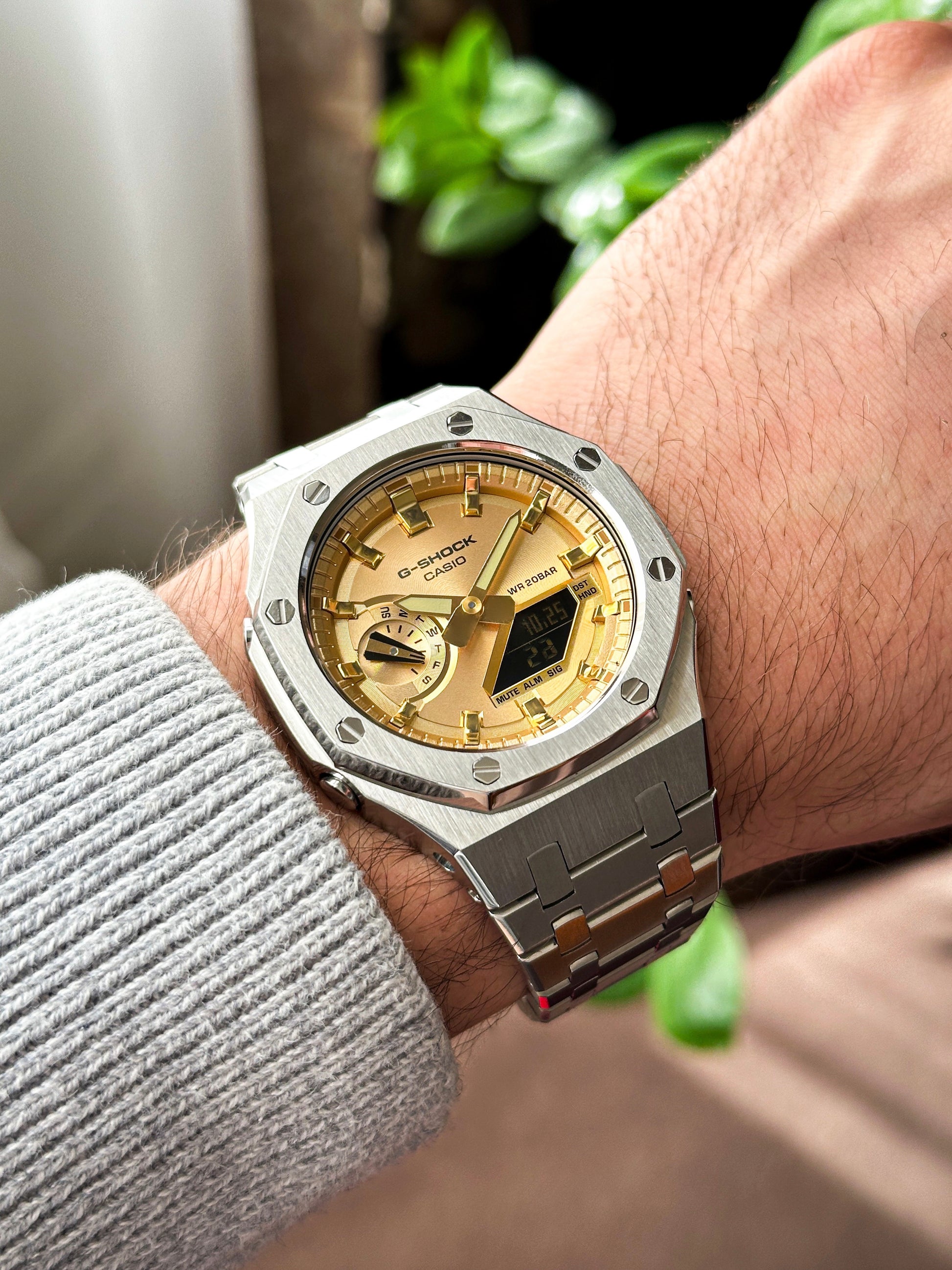 G-SHCOK CasiOak Potpuno srebrna - sa zlatnim brojčanikom sata