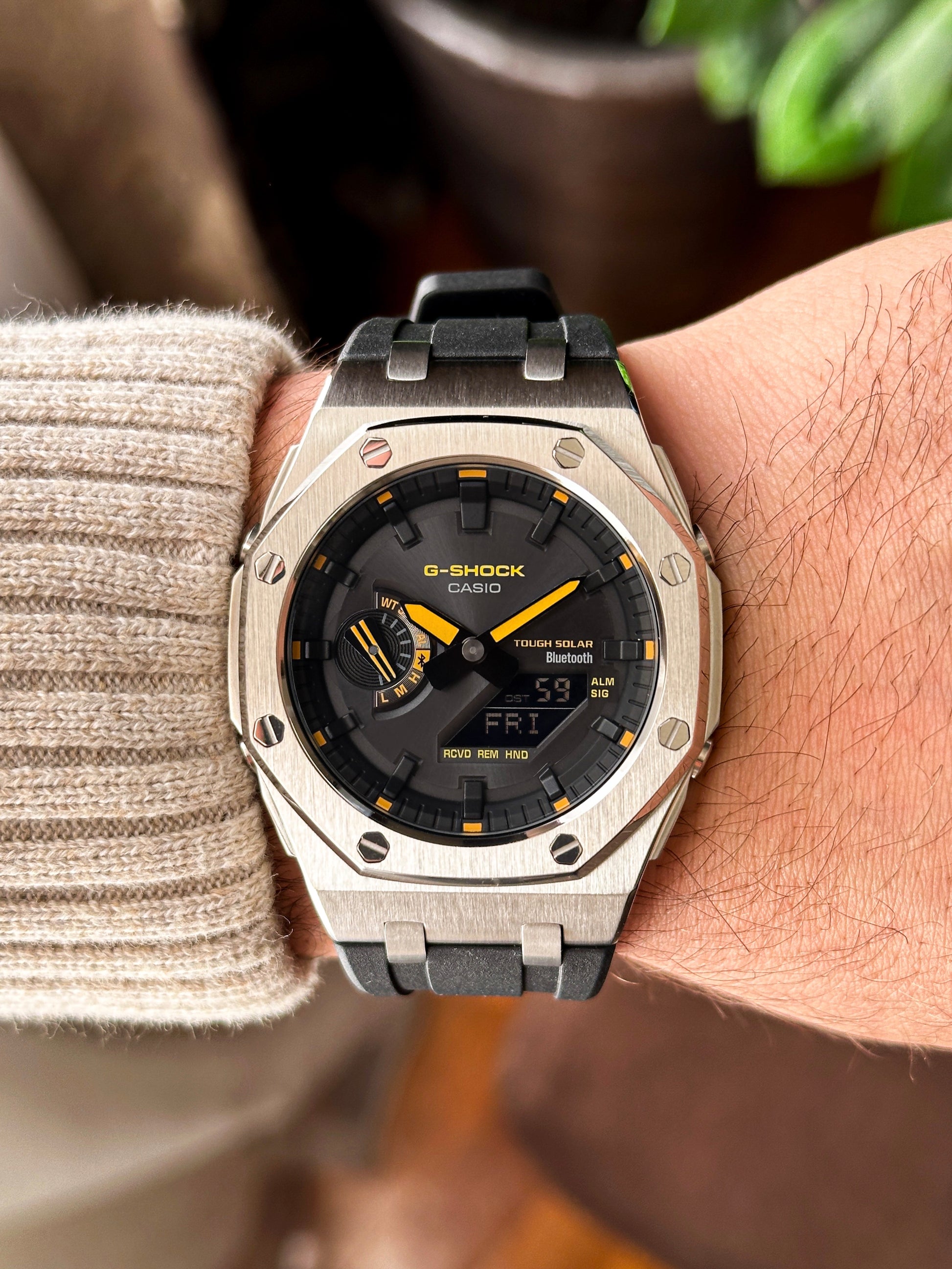 G-SHOCK CasiOak Crno srebrna - sa crno žutim brojčanikom sata (bt veza)